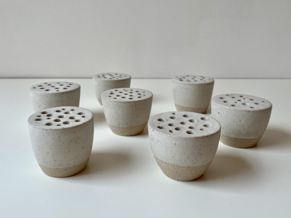 This handcrafted ikebana vessel is made from high-fired stoneware clay, giving it both durability and a warm, organic presence. The minimalist vessel features a built-in kenzan top with clean, circular openings for arranging branches and stems and allowing each stem stand with intention against the quiet beauty of the natural clay.