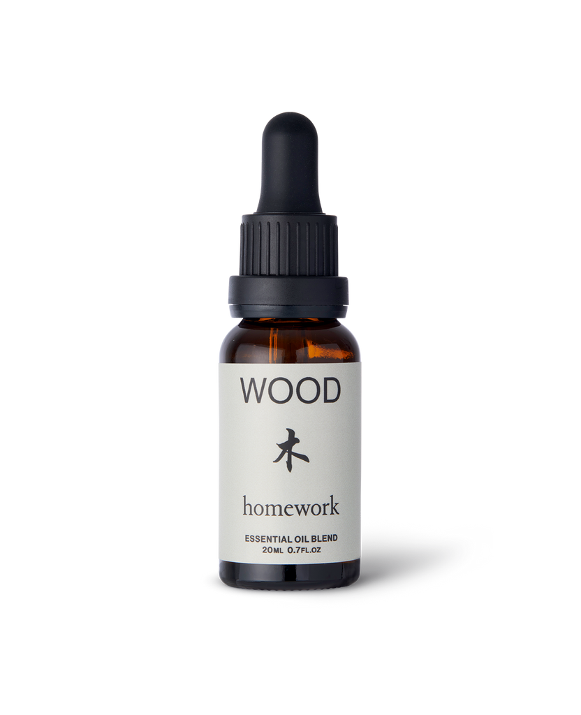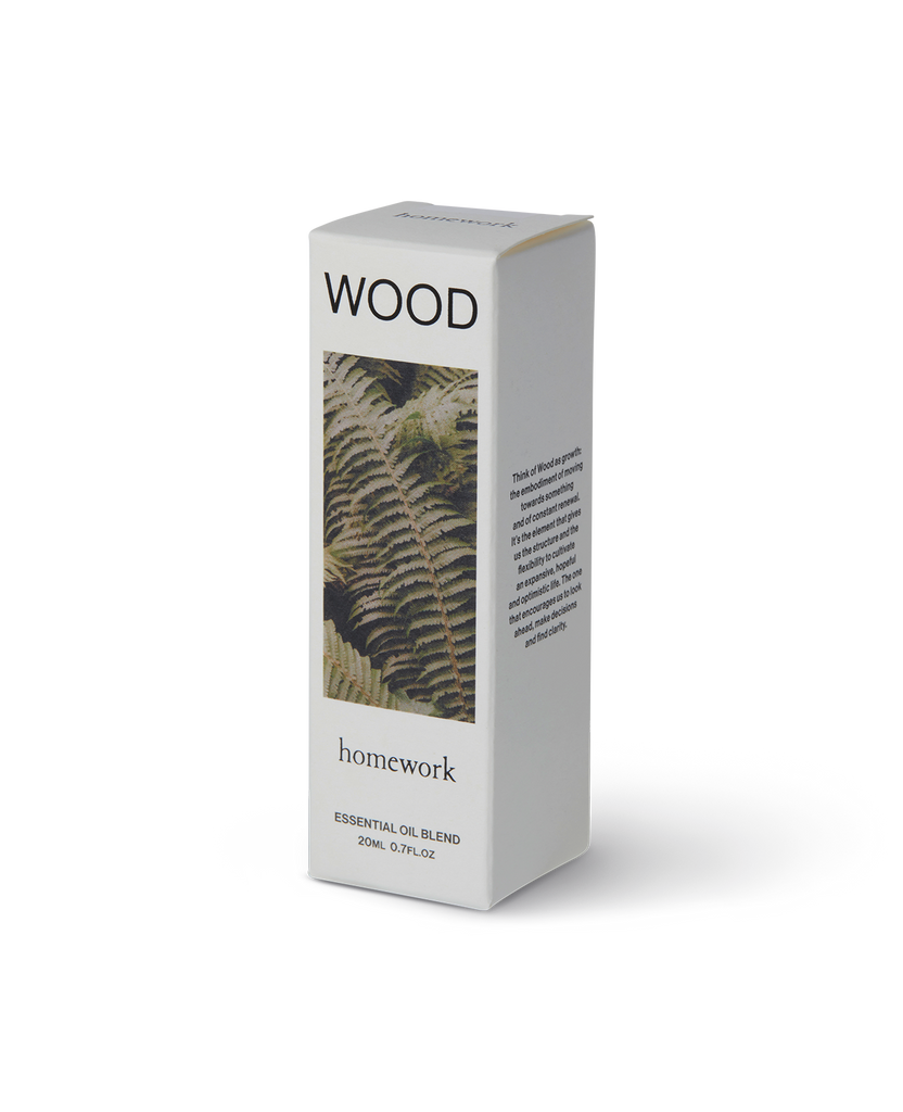 The wood essential oil, inspired by Traditional Chinese Medicine and the element of Wood, infuses green botanicals and gentle woods to stimulate focus, creativity, and clarity.